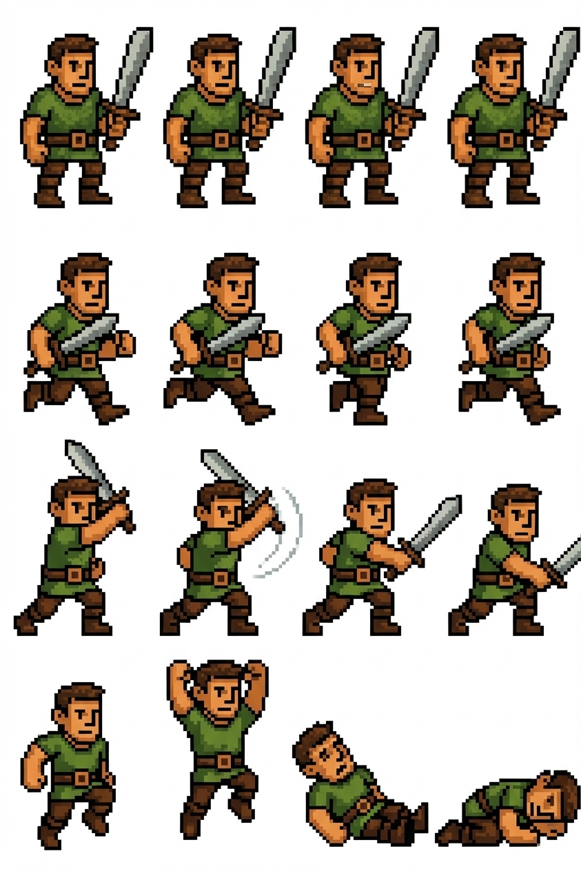 "i want a sprite sheet that includes all the stands of a brave warior with a sword its based on hunters and these things so i want a standing stand runing stands attaking stands jumping stands dying stands, in Pixel Art style"