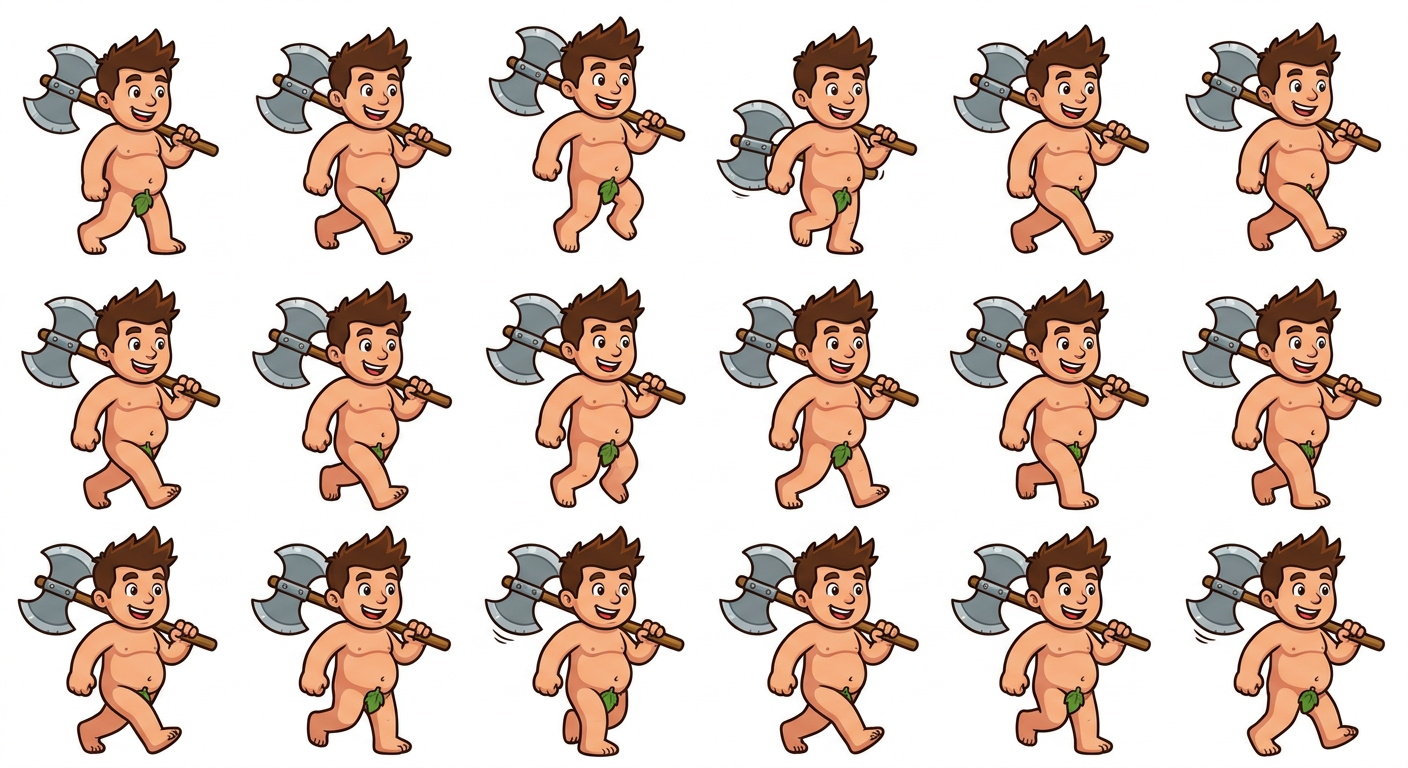 "A cartoon naked man with a large battleax that is cute and bounces when he walks"