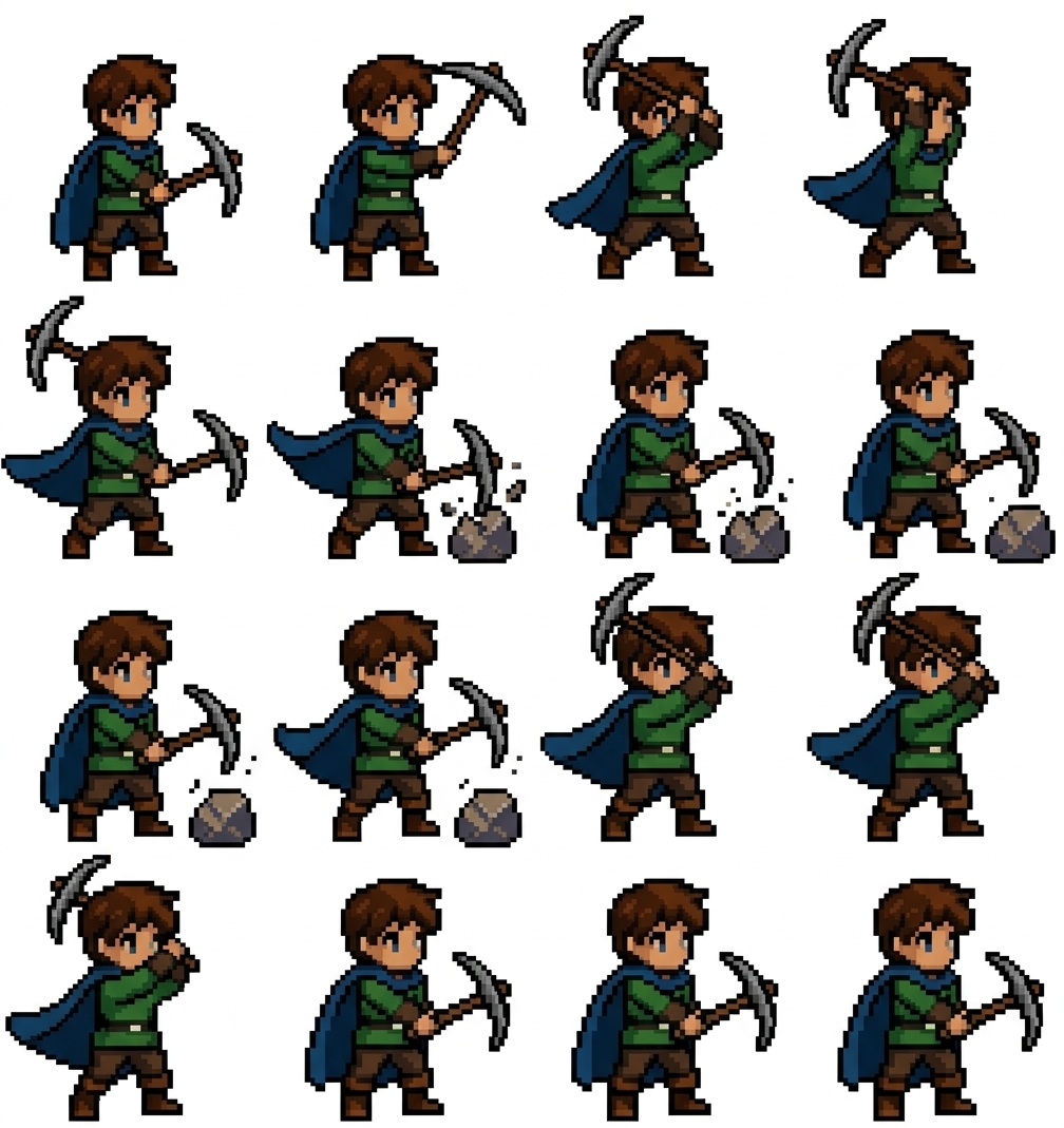 "use the 2nd pasted image for the 1st image and make it a 2d pixel animation sprite mining animation, in Pixel Art style"