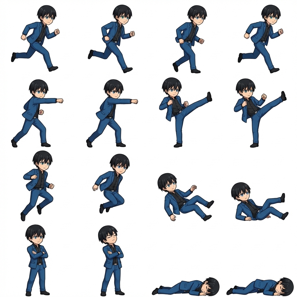 ارسم لي spritesheet لفتى بهذه المواصفات: anime serious  and strict boy with black ahort hair and blue eyes he wears blue jacket and black button-down shirt and blue pants the spritesheet contains running ,attack1(punch),attack2(kick),jumping,celeberation(if the character won),falling on the ground(if the character lost)