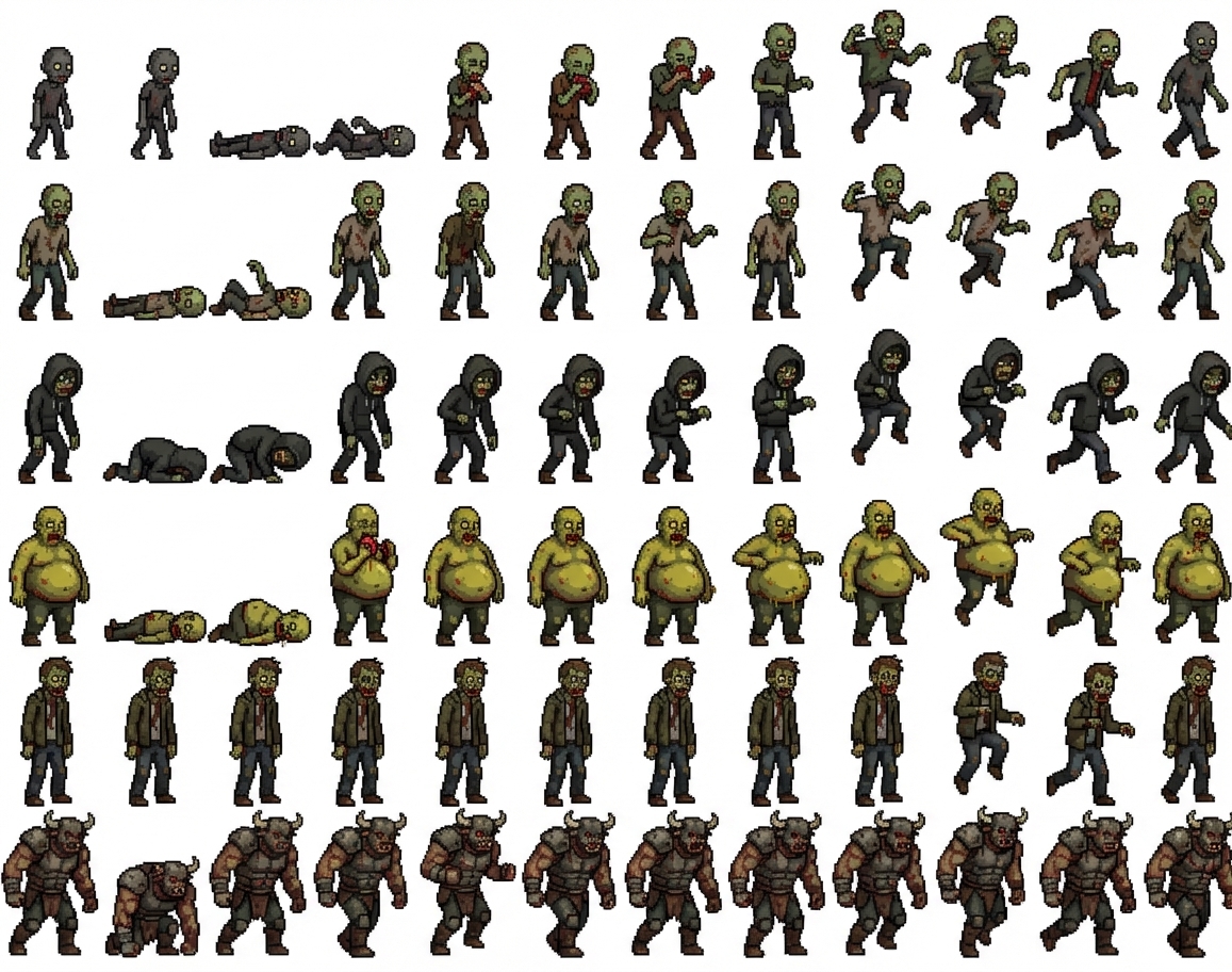 "Give me sample design of each zombie in sprite 32x48 pixelated, including the Walk; Dead; Eating; Hurt; Idle; Jump; Run; Walk Each movement have 8 frame loops, in Pixel Art style"