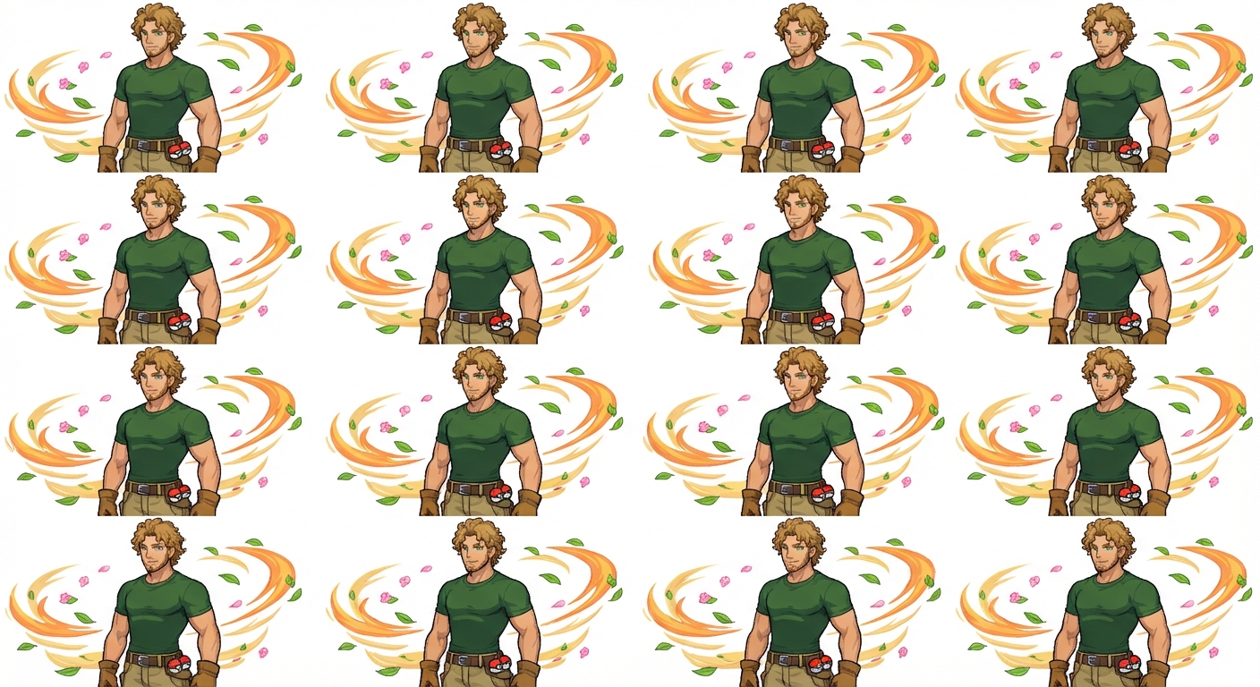 "I want a pokemon trainer who has curly light brown hair, green eyes, and is tall and muscular. He has a short beard. 1. He is a rival. 2. He is calm and confident, but not cocky. 3. He is a strategic trainer who 4. has a mixed set of pokemon but leans towards bug/grass types. 5. Tall, muscular. 6. He wears work pants (brown/khaki/light colored) with a fitted tshirt. 7. He wears gloves. 8. Orange, green, brown, any other accessory colors that fit well. 9. calm but ready to go. He should have a strong wind gust flowing around him with some leaves and flower petals caught up in it. 10. 25 3. He is calm, confident, and always ready to go. Smart and a hard worker, he loves to compete and never gives up"