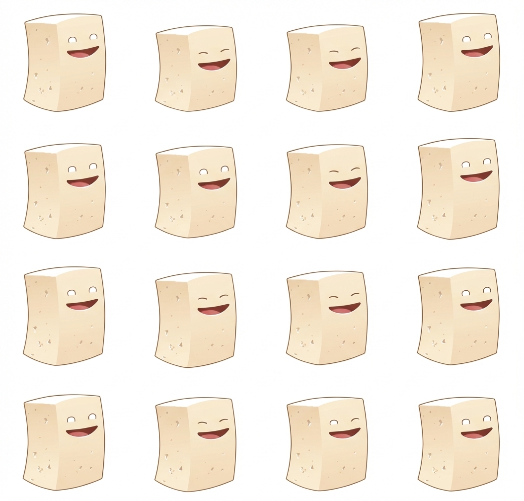 "Idle Squish movement Tofu from side to side with open mouth and blink every loop 1 time"
