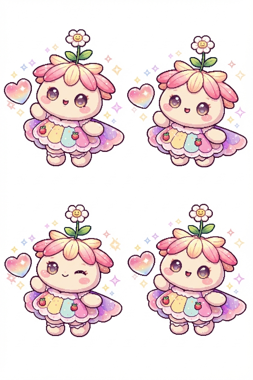 "What makes this SO Sproutcake: Round, soft body like a little marshmallow Petal "hair" instead of sprouts (even cuter!) Big sparkly eyes with heart highlights Tiny happy mouth Pastel rainbow dress with strawberries! Floating heart (just like the candy orb!) Soft, glowing, gentle vibes, in Pixel Art style"