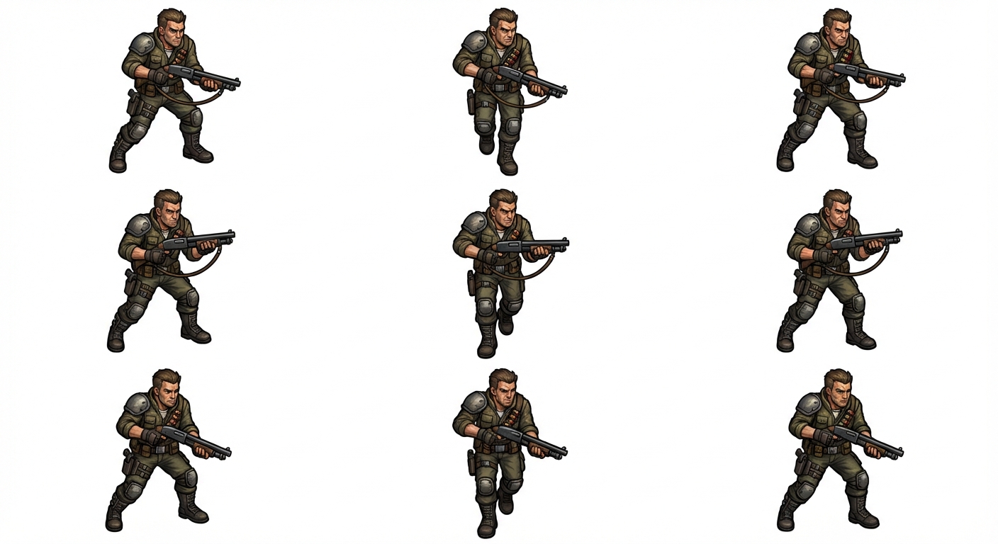 "Create a game-ready survivor hero character for a top-down zombie survival action game. Character type: shotgun survivor. Appearance: rugged post-apocalyptic scavenger, short tactical jacket, armored shoulder pad, utility belt, gloves, reinforced boots, compact shotgun, ammo straps, determined expression. Pose: ready for combat, slightly angled movement pose, weapon held clearly. Style: top-down / 3/4 view from above, stylized post-apocalyptic 2.5D game art, low poly inspired, mobile-game friendly, highly readable at small size, strong silhouette, clean shapes, consistent proportions, slightly gritty but colorful. Asset requirements: centered full body, transparent background, no environment, no text, no UI, no watermark.Core style: top-down / 3/4 view from above, stylized post-apocalyptic 2.5D game art, low poly inspired, mobile-game friendly, highly readable at small size, strong silhouette, clean shapes, consistent proportions, slightly gritty but colorful, game-ready character asset, centered full body, transparent background, no environment, no text, no UI, no watermark, same art direction, same camera angle, same lighting, same rendering style, same color language across the full set"