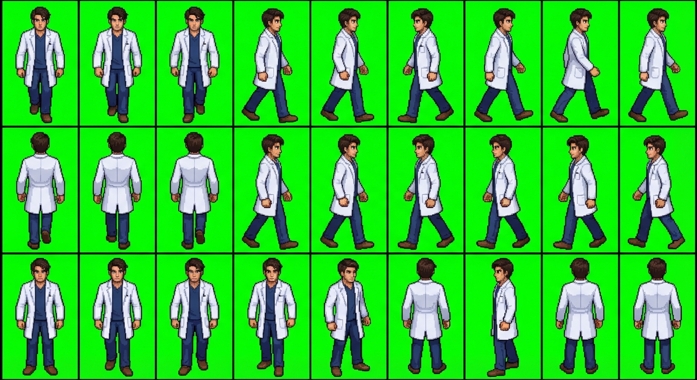"A 2D pixel art sprite sheet for a tall, athletic male character with dark brown hair. He is wearing a professional white Physical Therapy lab robe (mid-thigh length) over a modern outfit. Top-down 45-degree RPG perspective. 16-bit aesthetic, high quality, consistent lighting. The character looks like a medical professional but athletic. Includes walking and idle animations for front, side, and back views. Solid background for easy transparency removal."