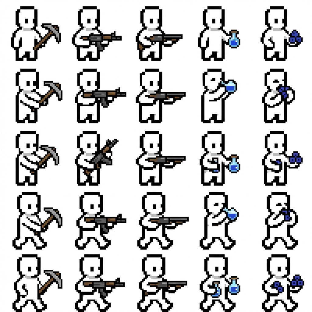 "i want this simple template character with the following animations for a platformer game: idle holding a pickaxe idle holding an assault rifle idle holding a shotgun idle holding a blue potion idle holding blueberries swinging pickaxe while idle shooting assault rifle while idle shooting shotgun while idle drinking blue potion while idle eating blueberries while idle idle pulling out the pickaxe idle pulling out the assault rifle idle pulling out the shotgun idle pulling out the blue potion idle pulling out the blueberries walking and swinging pickaxe walking and shooting assault rifle Walking and shooting shotgun walking and drinking blue potion walking and eating blueberries walking while holding pickaxe walking while holding assault rifle walking while holding shotgun walking while holding blue potion walking while holding blueberries walking while pulling out pickaxe walking while pulling out assault rifle walking while pulling out shotgun walking while pulling out blue potion walking while pulling out blueberries "
