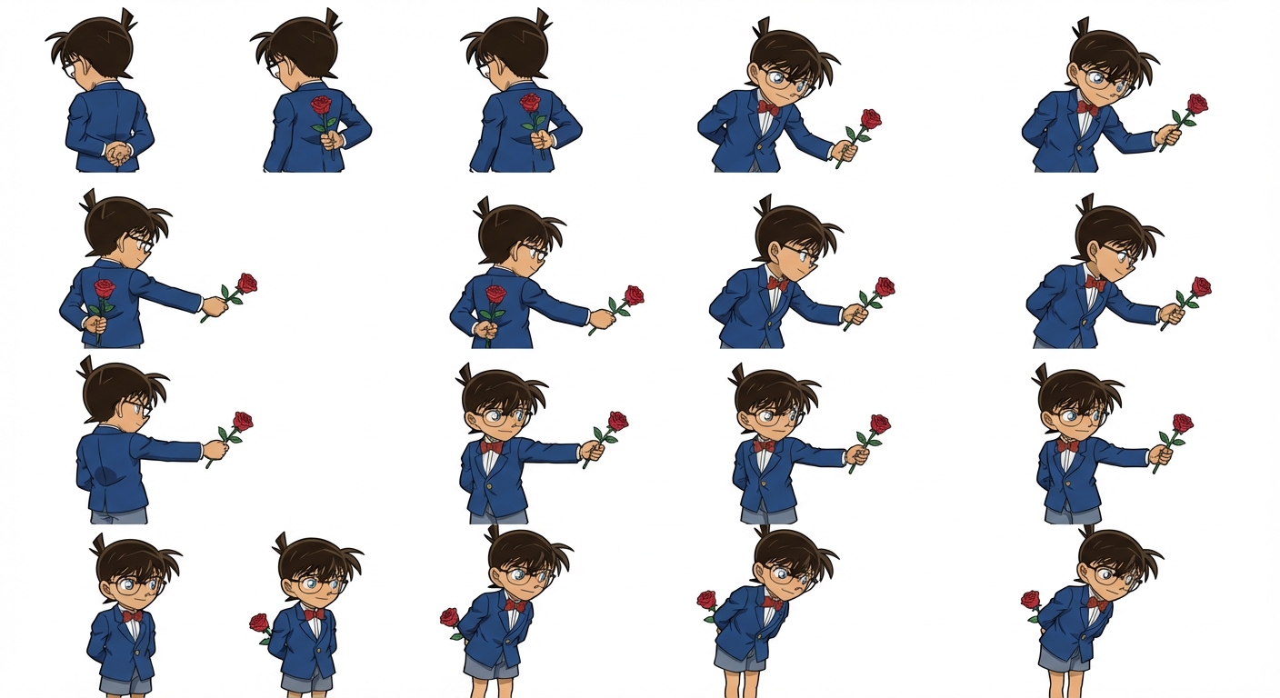 "Create Conan Edogawa pulling out a rose behind his back and holding it up front"