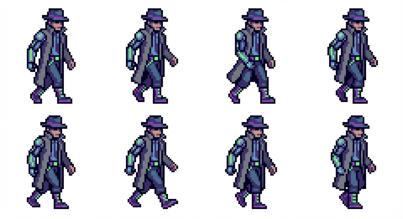 "Positive Prompt: animated sprite sheet, walking animation frames, 8-frame walk cycle sequence, side view character walking, animation sequence not static poses, moving character frames, walk cycle sprite sheet, looping animation frames, cyberpunk detective walking, pixel art game animation, frame-by-frame walking motion, NOT turnaround reference Negative Prompt: static poses, character turnaround, T-pose, reference sheet, standing still, pose reference, character sheet, multiple angles standing, NOT animated, idle poses, stationary character, in Pixel Art style"