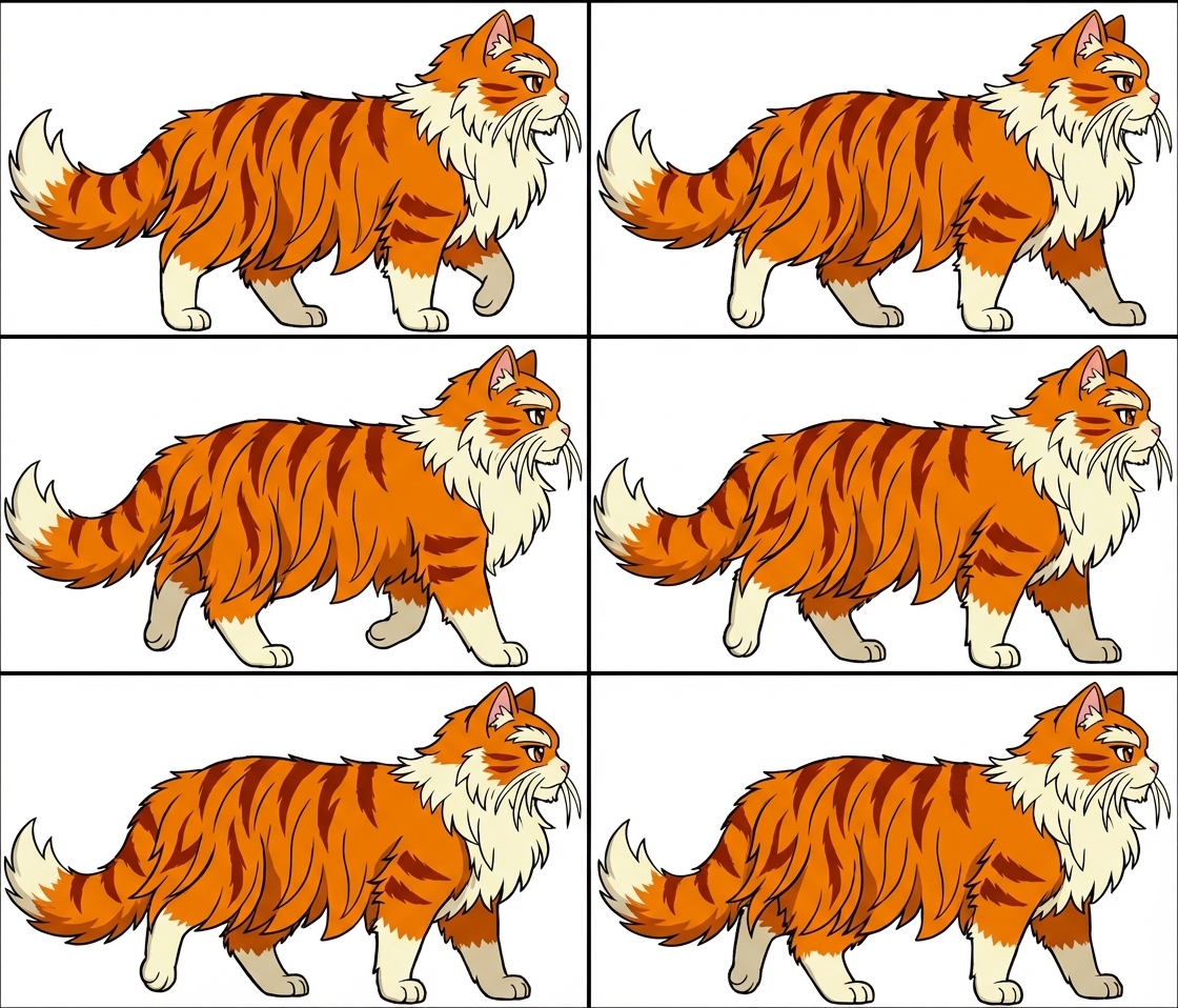 "A distinguished, elderly, long-haired anime cat in flawless orthographic side-profile, facing right against an infinite white backdrop. Its fur is a deep, rich orange (#FF8C00) with crisp, thick burnt auburn tiger stripes across the back and limbs (#B93C00), and two delicate cheek stripes. The cat's chest mane, paws, tail tip, and extravagant drooping whiskers and eyebrows are Pastel Light Cream (#FFFFE6), while its delicate nose and inner ears blush (#F0C8BE). Hazelnut eyes (#B85F2F) with thin vertical slit pupils. The artwork is vector-crisp, with bold black contour lines, flat unshaded colors, and meticulous precision—negative space between all four legs, and a frosted-edged fur texture suggesting age-softened luxury. A pure void background ensures focus remains on the feline., in Vector Art style"