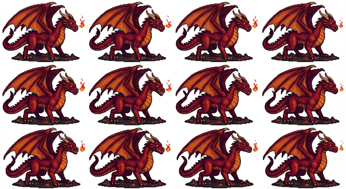 "red dragon pixel art sprite, medium-sized western dragon standing on four legs, dark crimson scales with lighter orange belly and underwing membranes, large bat-like wings folded against body with visible bone structure and membrane veins, long thick tail with spiked tip curling behind, angular reptilian head with two curved horns pointing backward, fierce yellow eyes with slit pupils, rows of small sharp teeth visible in slightly open mouth, small flames flickering from nostrils, muscular build with visible scale patterns on neck and legs, sharp black claws on each foot, dark rocky ground with small embers scattered around, 16-bit retro RPG style like Breath of Fire and Shining Force, crisp pixel outlines, rich red-orange-gold color palette, side view facing right suitable for game sprite animation, transparent background"