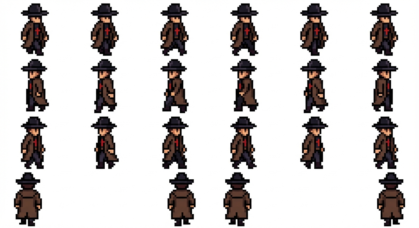 "i need a sprite for my player character i want him to have a hat like an inquisitor and a long coat with a cross on it"