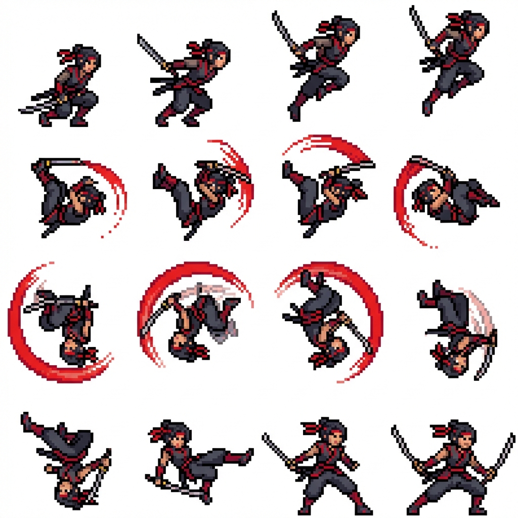 "Colorful pixel art female ronin warrior with dual katanas, samurai-inspired outfit in dark gray with vivid red accents, short black hair and red headband. Multi-frame sprite sheet animation of an extended backward flip: she pushes off the ground, rises high into the air, tucks her knees, and rotates backward through many in-air frames, forming a smooth, elegant curved motion arc. At the apex, her body is fully inverted, blades trailing with motion streaks. She continues rotating with controlled momentum before landing lightly in a combat stance. Bright, saturated pixel colors, strong contrast, clean outlines, readable silhouette at small scale. Emphasized motion trails, arc indicators, subtle afterimages, expressive cloth and scarf movement. Clear anticipation → lift-off → multiple airborne rotation frames → landing. Game-ready 2D pixel sprite sheet, fluid animation, indie action / roguelike style. in a 4x4 grid"