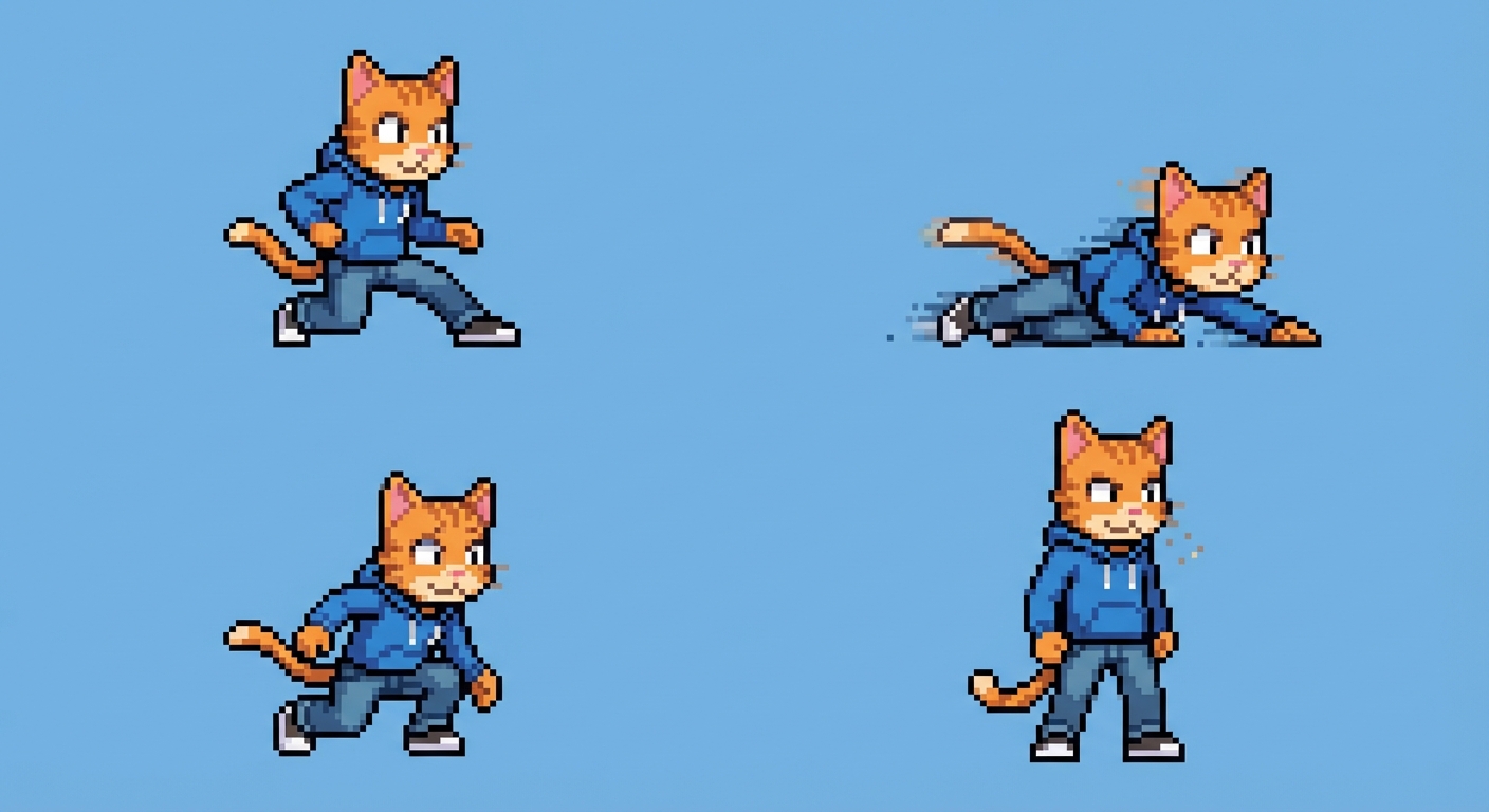 "a cartoon anthropomorphic dressed cat sliding at 1K resolution, in Pixel Art style"