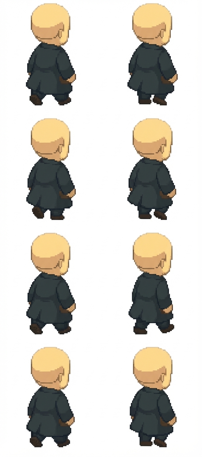 "Make a walk cycle of him with his feet actually taking steps make it 8 frames if you need to"