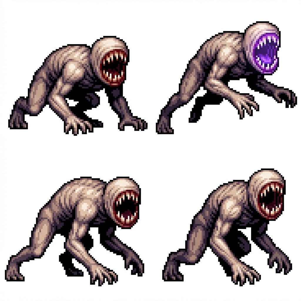 "It's a basic enemy called crawler. It seems to be humanoid but is walking on all 4 limbs. It has no eyes, ears or nose. It only has a mouth which is always open. Teeth are razor sharp. It is inspired by kingdom 2 crowns, vampire survivors. The inside of the mouth has some violet glow. create a 64x64 pixel sprite sheet animated for a walking animation. The walking looks lik lunging. It reaps forward to grab its enemies and lands on the front limbs getting ready to leap again., in Pixel Art style"
