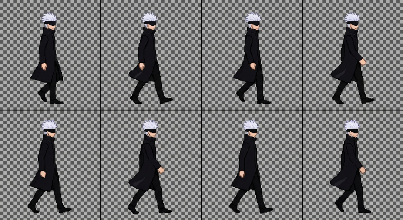 "side view FULL BODY walk animation sprite sheet of an anime-inspired male sorcerer character, visually extremely close to a white-haired blindfolded anime sorcerer but fully original and safe to use, tall slim proportions, very light white spiky hair, black blindfold covering eyes, sharp jawline, calm confident expression, modern black long coat with high collar, minimalist outfit, no armor, no logos, FULL BODY VISIBLE IN EVERY FRAME, head to feet visible, feet clearly touching ground, no cropping, no zoom, no camera framing changes, LIGHT WALK CYCLE, natural step motion, subtle coat movement, 8 frames, horizontal sprite sheet, single character only, consistent proportions, centered character per frame, pixel art style, clean outline, simple shading, transparent background, game-ready, commercial use allowed "