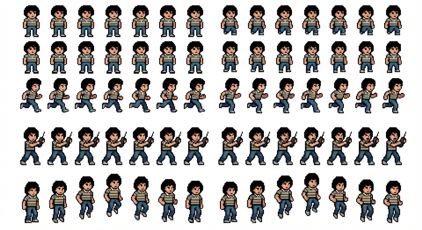 "Create me a 2D character spritesheet of Mike from stranger things, the character sprite sheet must include idle, running and attack animations, also jumping make it so the grid size will be 8x8 for each sprite, in Pixel Art style"