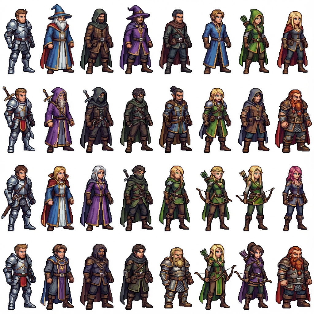 "I need a 1024x1024 sprite sheet with transparent background that consists of 32 frames, 8 columns and 4 rows of 128w x 256h sprites. These are to be Hi-res pixel art Adult Film Star Fantasy heroes, full view and characters should be facing to the right. We want lots of diversity and flavor. 16 males and 16 females to keep it even"