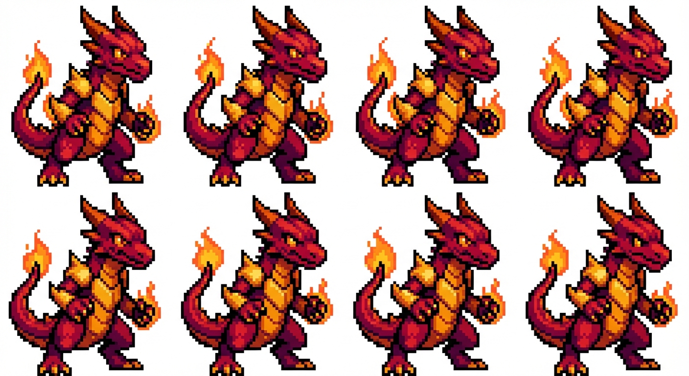 "Retro 16-bit pixel art monster companion, Pokémon-style original creature, small agile dragon-like animal, toned-down cuteness, sharper silhouette, glowing amber eyes, subtle flame aura around claws and tail, confident battle-ready pose, clean pixel shading, bold contrast colors (crimson, gold, deep orange), detailed sprite but simple shading, white background, action RPG aesthetic, heroic and loyal companion, energetic but mature design"