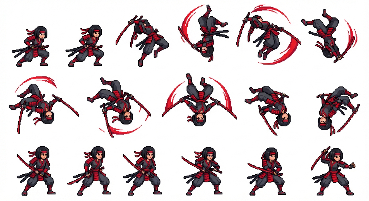 "Colorful pixel art female ronin warrior with dual katanas, samurai-inspired outfit in dark gray with vivid red accents, short black hair and red headband. Multi-frame sprite sheet animation of an extended backward flip: she pushes off the ground, rises high into the air, tucks her knees, and rotates backward through many in-air frames, forming a smooth, elegant curved motion arc. At the apex, her body is fully inverted, blades trailing with motion streaks. She continues rotating with controlled momentum before landing lightly in a combat stance. Bright, saturated pixel colors, strong contrast, clean outlines, readable silhouette at small scale. Emphasized motion trails, arc indicators, subtle afterimages, expressive cloth and scarf movement. Clear anticipation → lift-off → multiple airborne rotation frames → landing. Game-ready 2D pixel sprite sheet, fluid animation, indie action / roguelike style."