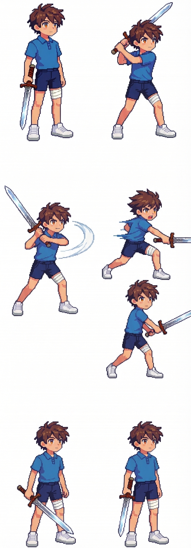 "男孩向前挥剑: # Role: Expert 2D Game Animator & Pixel Sprite Sheet Artist # Task: Generate a frame-by-frame attack animation sequence based on the provided reference image. ## 【Part 1: Technical Framework / 动画框架约束】 (English) - Output Format: A horizontal Sprite Sheet with a 1x6 Grid (one row, six columns). - Alignment: Every frame must have identical dimensions. The character must be perfectly centered within each 256x256 pixel cell to ensure no "jittering" in Godot. - Visual Consistency: Character identity (brown hair, blue shirt, navy shorts, leg band-aid, sword design) must be 100% consistent with the reference image. - Style: High-fidelity 2D Fantasy Pixel Art, 6-head tall proportion, 45-degree top-left lighting. - Background: Strictly pure solid white background (#FFFFFF). ## 【Part 3: Physics & Perspective / 物理与透视校准】 (Hybrid) - Perspective: 保持 3/4 俯视战棋视角(3/4 isometric tactical view)。 - Physics: 挥剑时头发和衣服下摆应有轻微的物理偏移(Dynamic physics for hair and clothing during the swing)。 - Scale Control: 确保在每一帧中,角色的头身比(6-head tall)和身高像素高度保持绝对恒定,避免缩放感。 --- ## 【Part 4: Quality & Negative Prompts / 质量控制与负向指令】 (English) - Constraint: Ensure no motion blur between frames; each pixel must be crisp. - Strictly Prohibit: No overlapping frames, no camera zoom, no inconsistent limb lengths, no missing weapon, no ground shadows. - Negative Prompt: (3D style, blurry edges, photorealistic, messy grid, character not centered, changing clothes, disappearing band-aid)."