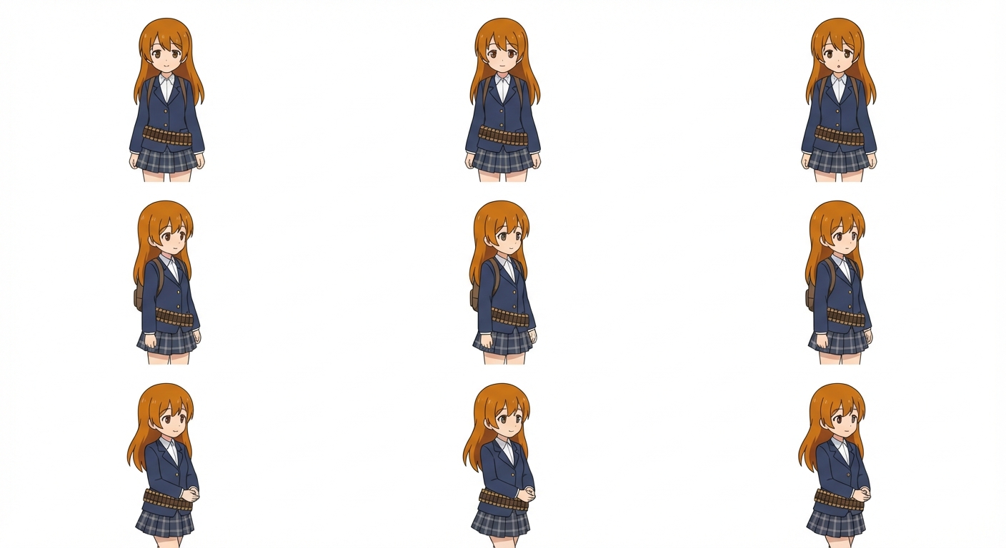 "a anime girl wearing a school uniform, she also wears a bullet belt. she has bright brunette hair, small taille., in Flat / Minimalist Art style"