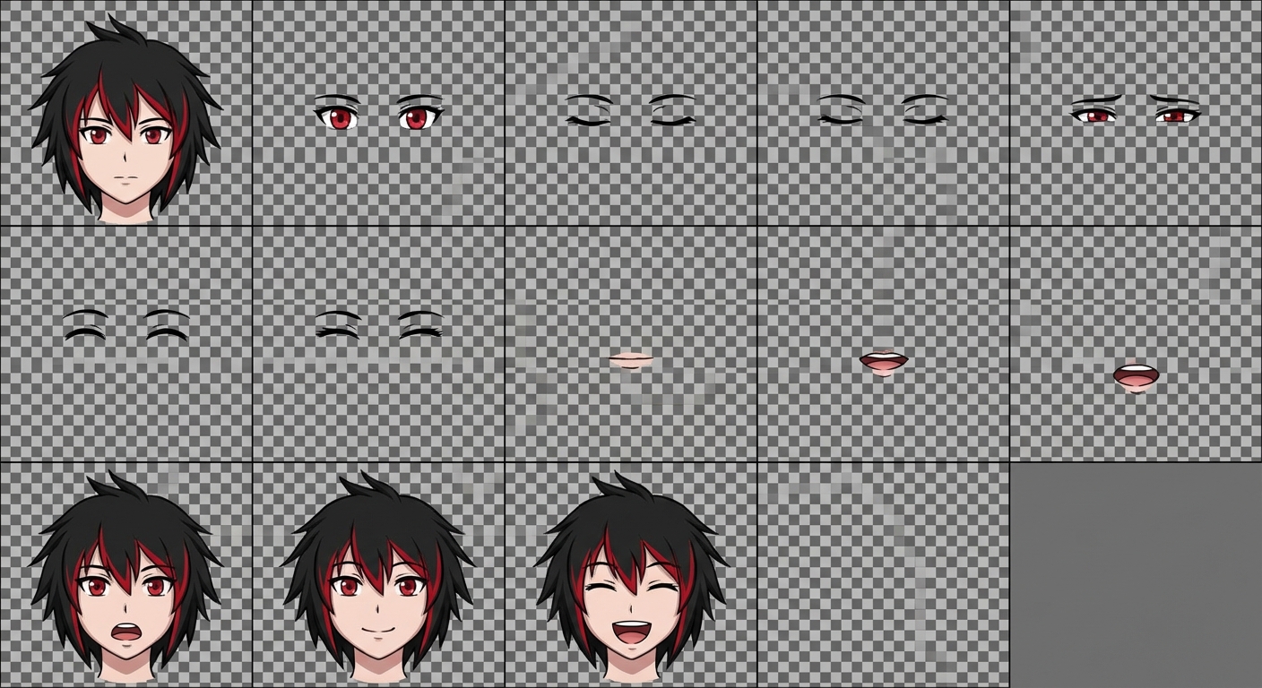"Create a sprite sheet of a simplified anime-style female AI companion. Requirements: - Canvas: 300x300 px per tile - Transparent background - Head only (neck/collar minimal), centered - Base head: black spiky hair framing the head, red eyes with subtle red highlights, neutral calm expression, simplified anime-style, no photorealism, clean illustration - Eyes overlays (5 tiles): neutral (default), blink (closed), concern (slightly worried), joy (arched happy), laugh (squinted/laughing) - Mouth overlays (5 tiles): closed (neutral), slightly open talking, more open talking, small smile, open-mouth laughter - Style: semi-realistic anime, flat shading, optional soft red accent for cyberpunk vibe - Layout: 11 tiles total, arranged in a grid (rows or columns), perfectly aligned, each tile exactly 300x300 px - Output: transparent PNG sprite sheet with all tiles aligned for easy layering in HTML/CSS/JS Tile order suggestion: 1. Base head 2. Eyes neutral 3. Eyes blink 4. Eyes concern 5. Eyes joy 6. Eyes laugh 7. Mouth closed 8. Mouth talk1 (slightly open) 9. Mouth talk2 (more open) 10. Mouth smile 11. Mouth laugh "