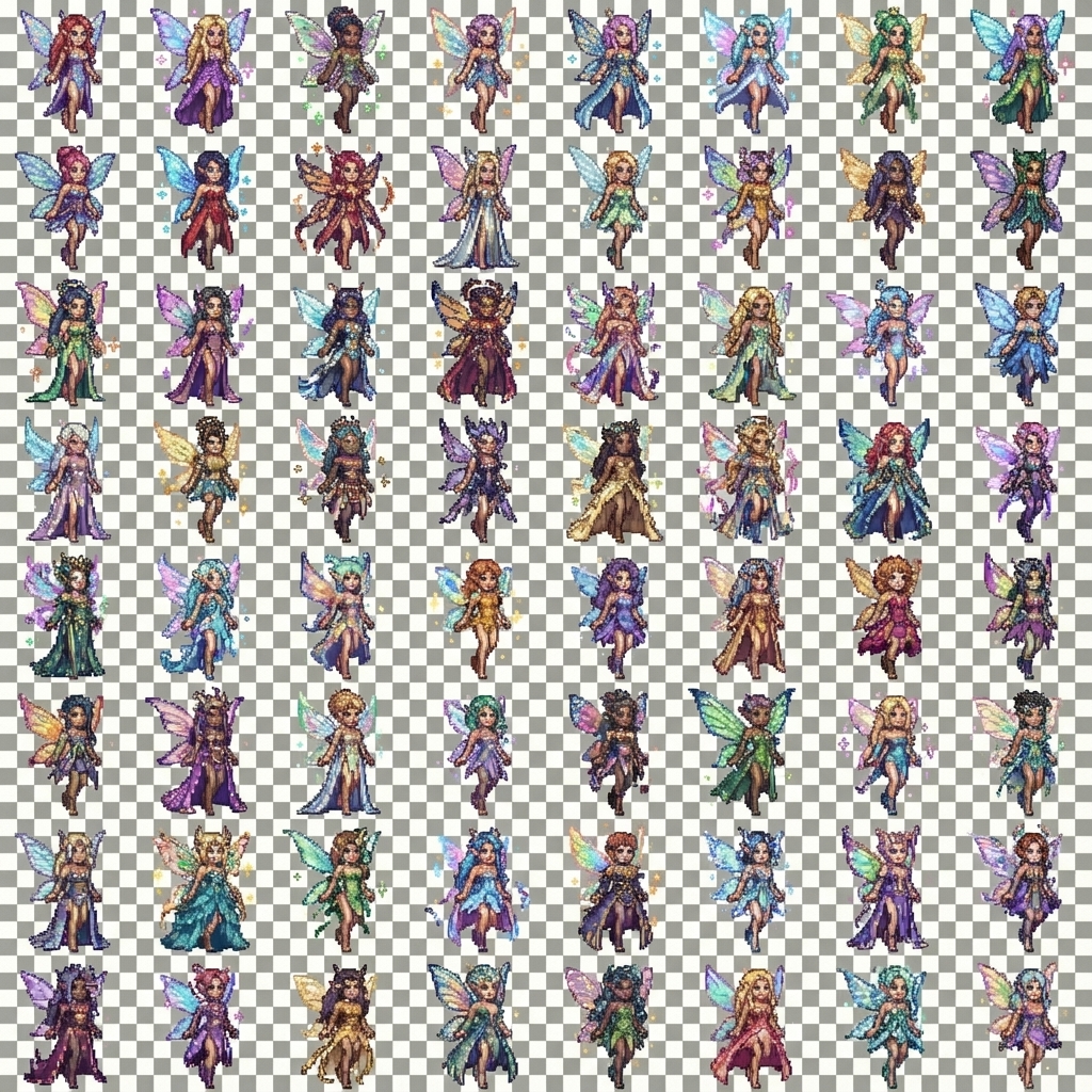 "I need a 1024x1024 sprite sheet with transparent background that consists of 64 frames, 8 columns and 8 rows of 128w x 128h sprites. These are to be Hi-res pixel art adult film star fantasy fairies, sprites and pixies, full view and characters should be facing to the right. We want lots of vibrant colors, diversity and flavor."