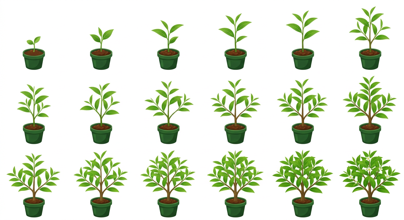 "growing green tea plant, from seedling to ready to harvest plant, in Vexel Art style"