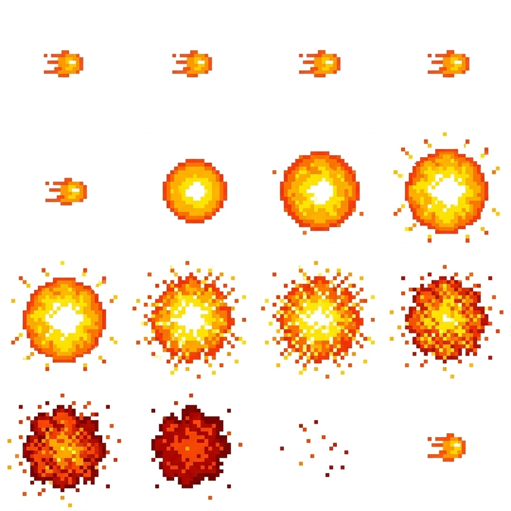 "Dynamic pixel art fire explosion effect, blazing fireball impact, parks flying, fluid animation, in Pixel Art style"