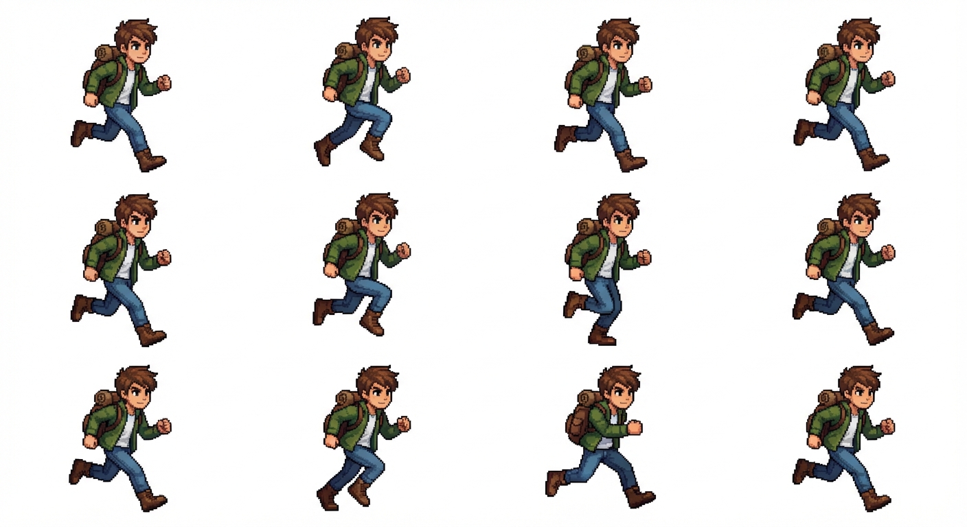 "a young male character , an adventurer, wearing jeans, t shirt, jacket running"