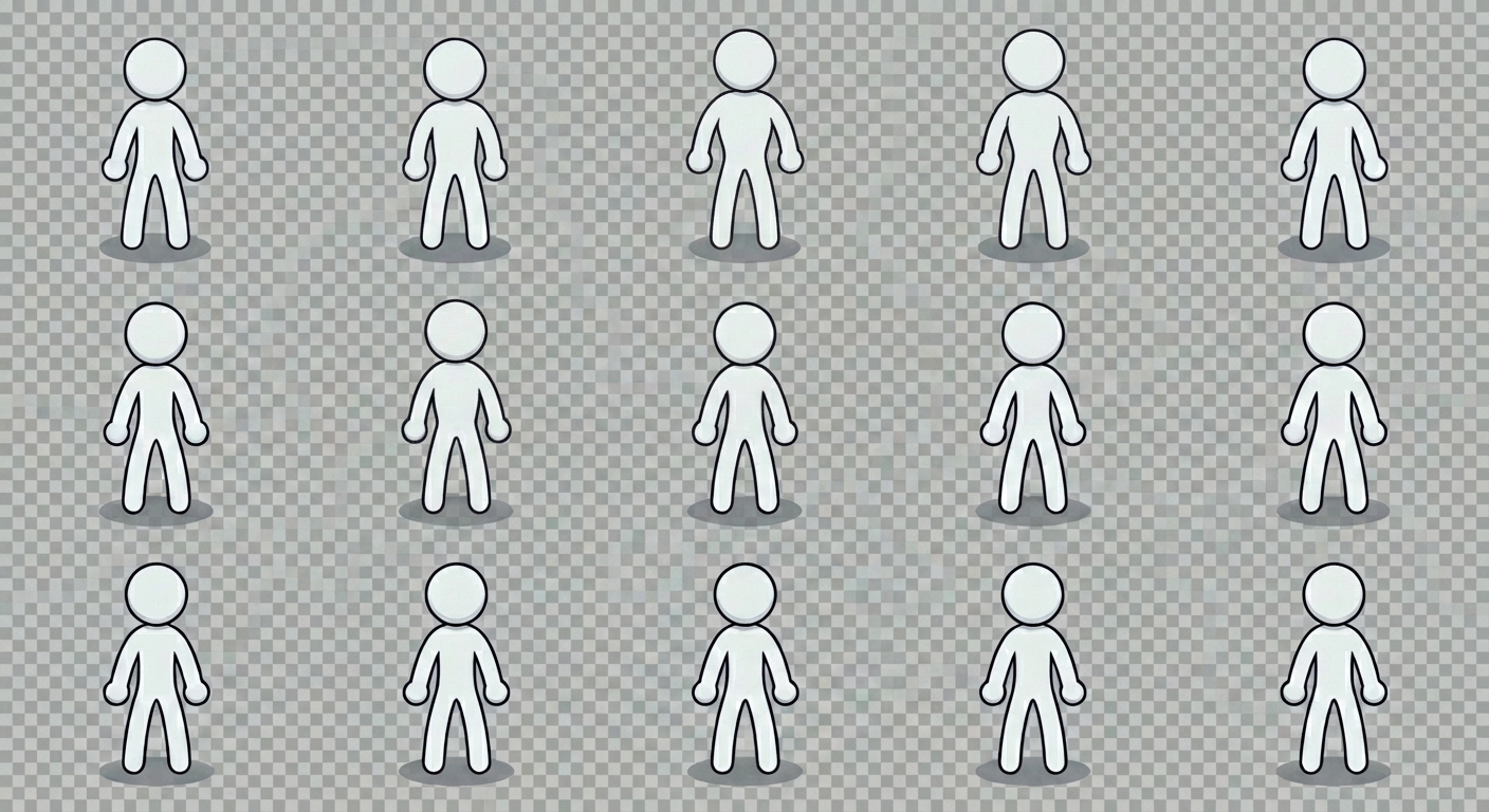 "Minimalistic 2D stickman sprite sheet, 8-frame idle breathing animation, front view, rounded head, rounded hands and legs, smooth curved limbs, matte white body, no facial features, clean vector flat design, subtle breathing motion (slight chest expansion and gentle body bounce), consistent proportions across frames, symmetrical, soft shadow underneath, transparent background PNG, evenly spaced frames, game-ready sprite sheet "