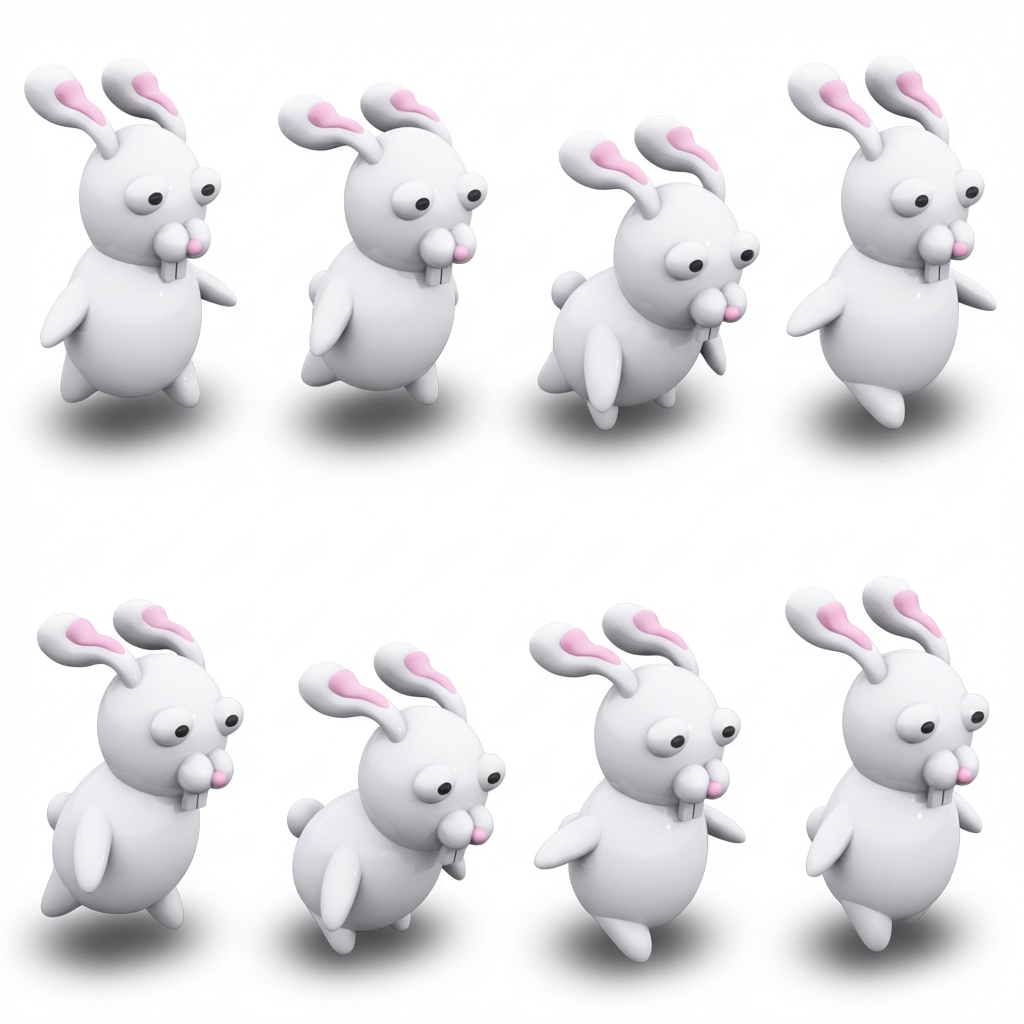 "Generate an 8-frame sprite animation of the SAME cute 3D rabbit running. Frame rules: - Fixed camera - Identical character identity - Only legs, arms, ears, and slight body bounce should change - No rotation or camera movement - White / transparent background Motion details: - Front and back legs alternate forward/back - Body slightly compresses on ground contact - Ears lag slightly behind movement Output: - Individual PNG frames - Square size (512x512) - Clean edges suitable for sprite sheet "