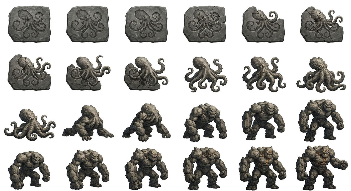 "a prehistoric fossil of an octopus transforming through evolution into a living 40 ft tall rock giant"