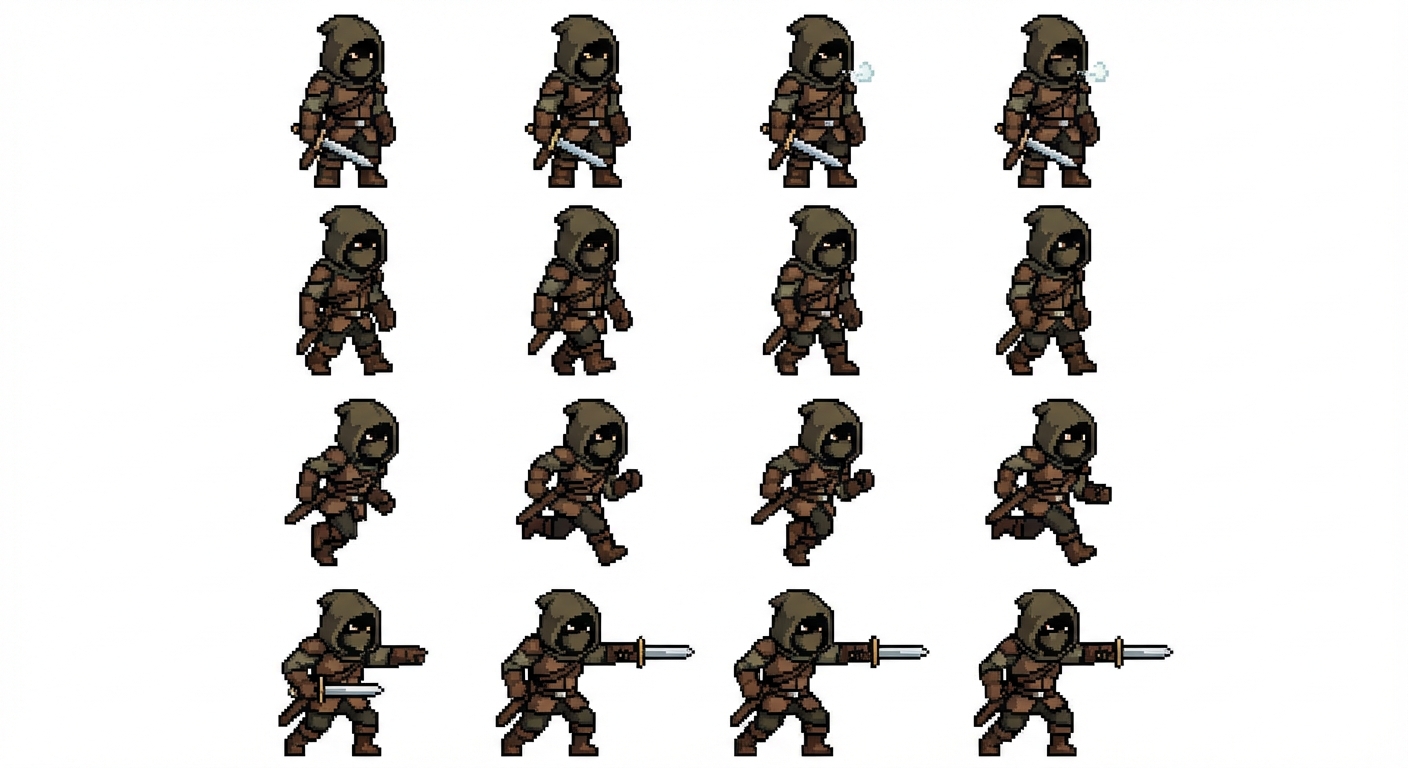 "create a new sprite sheet that has idle, run, walk, attack animations for a soilder or a rogue like charater"
