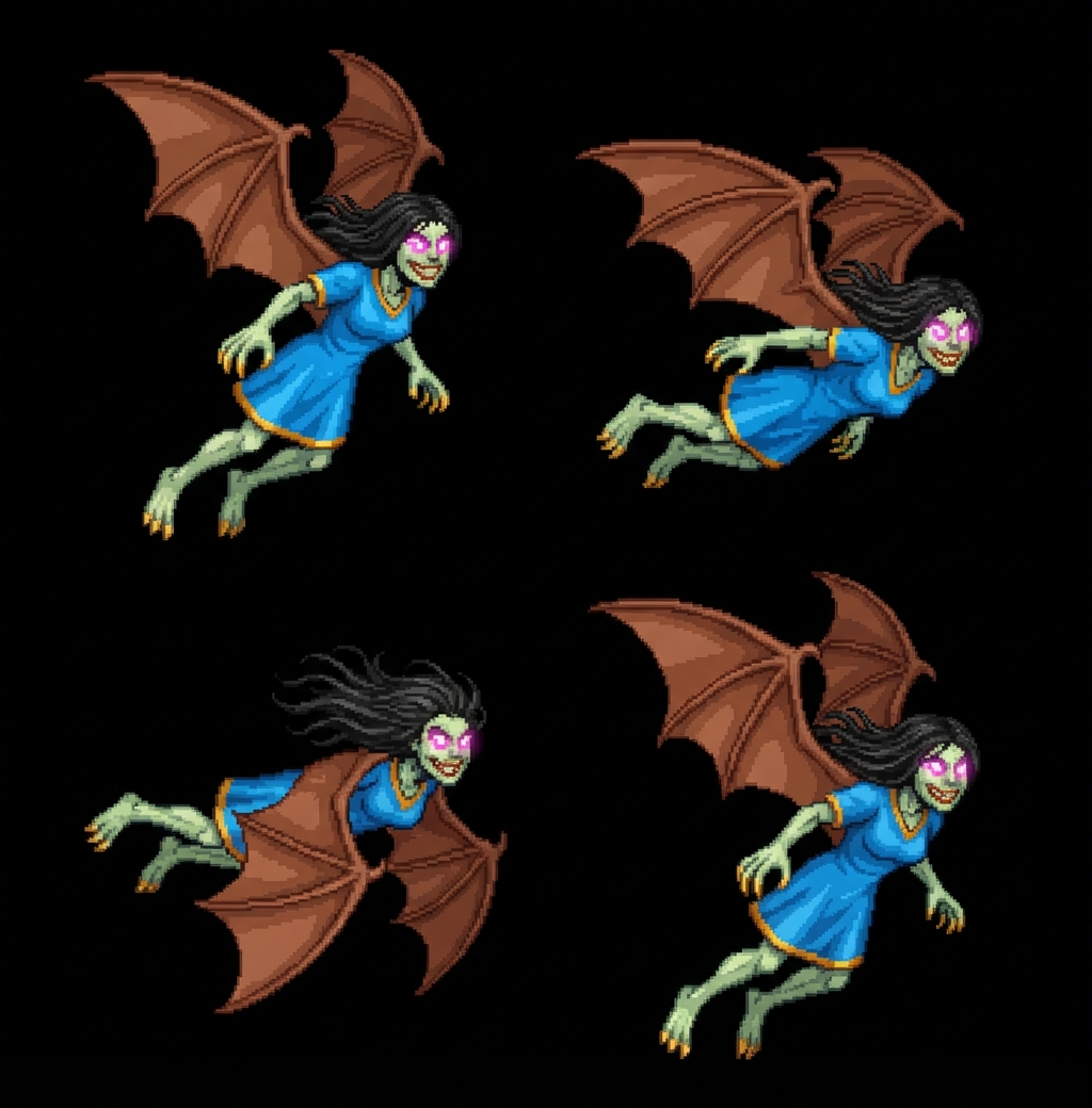 ""Pixel art sprite sheet, 16-bit style. A friendly green-skinned girl with long black hair, glowing pink eyes, wearing a blue dress and brown bat wings. Action: Flying chase sequence facing right. 4 distinct frames showing a flying cycle: 1. Wings up and body leaning forward, 2. Wings mid-flap pushing back, 3. Wings fully down and hair trailing behind, 4. Wings recovering up. High contrast, vibrant colors, solid black background, horizontally aligned frames for easy animation clipping.""
