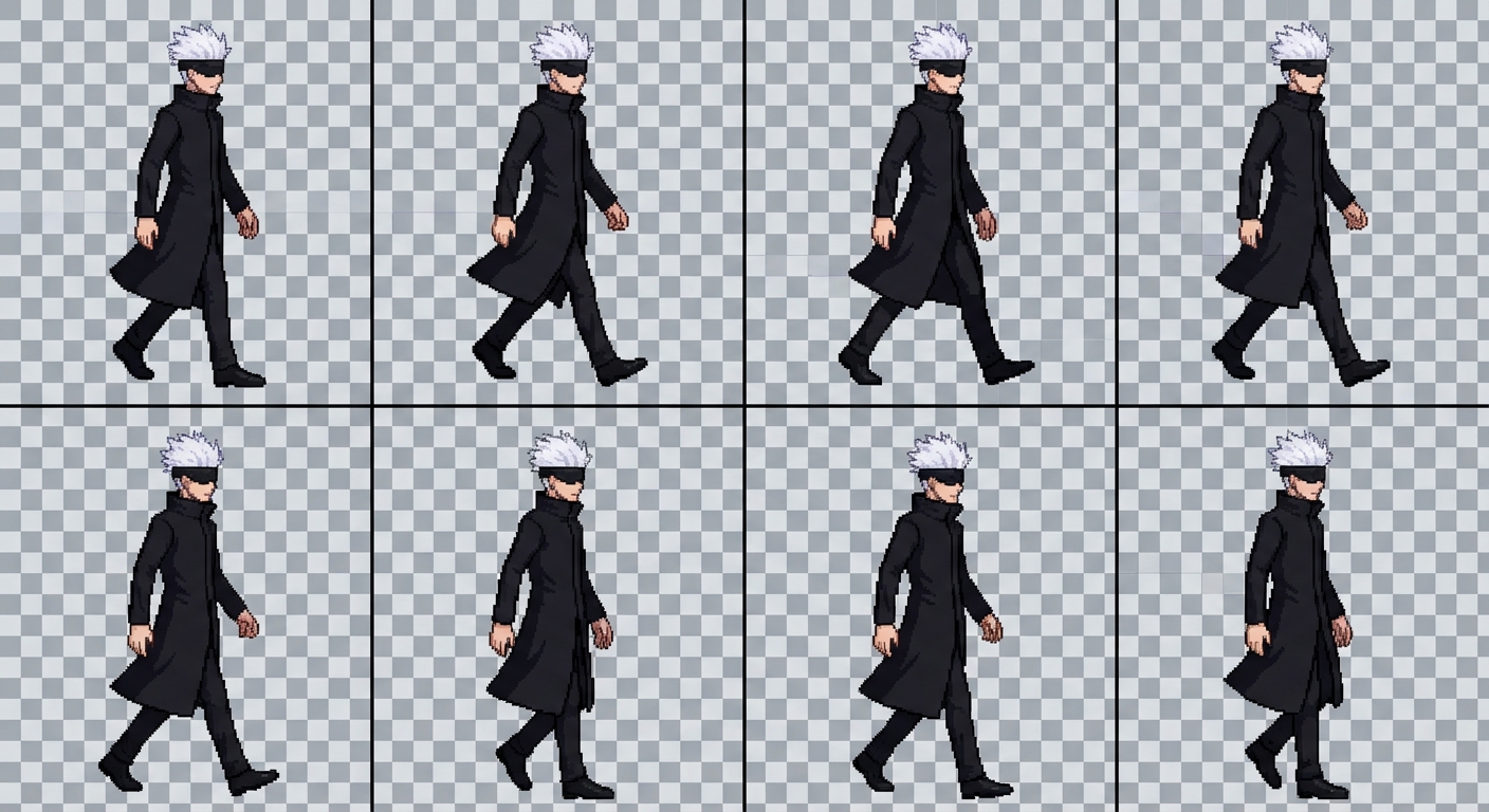 "side view FULL BODY walk animation sprite sheet of an anime-inspired male sorcerer character, visually extremely close to a white-haired blindfolded anime sorcerer but fully original and safe for commercial use, tall and slim proportions, very light white spiky hair, black blindfold covering eyes, modern black long coat with high collar, minimalist outfit, no armor, no logos, clean elegant silhouette, CHARACTER MUST FIT PERFECTLY INSIDE EACH FRAME, full body visible from head to feet in every frame, no cropping, no zoom, no camera movement, consistent framing, character centered vertically and horizontally, LIGHT WALK CYCLE, natural step motion, subtle coat movement, no exaggerated motion, 8 frames, horizontal sprite sheet, single character only, consistent proportions across all frames, pixel art style, clean outline, simple readable shading, transparent background, game-ready "