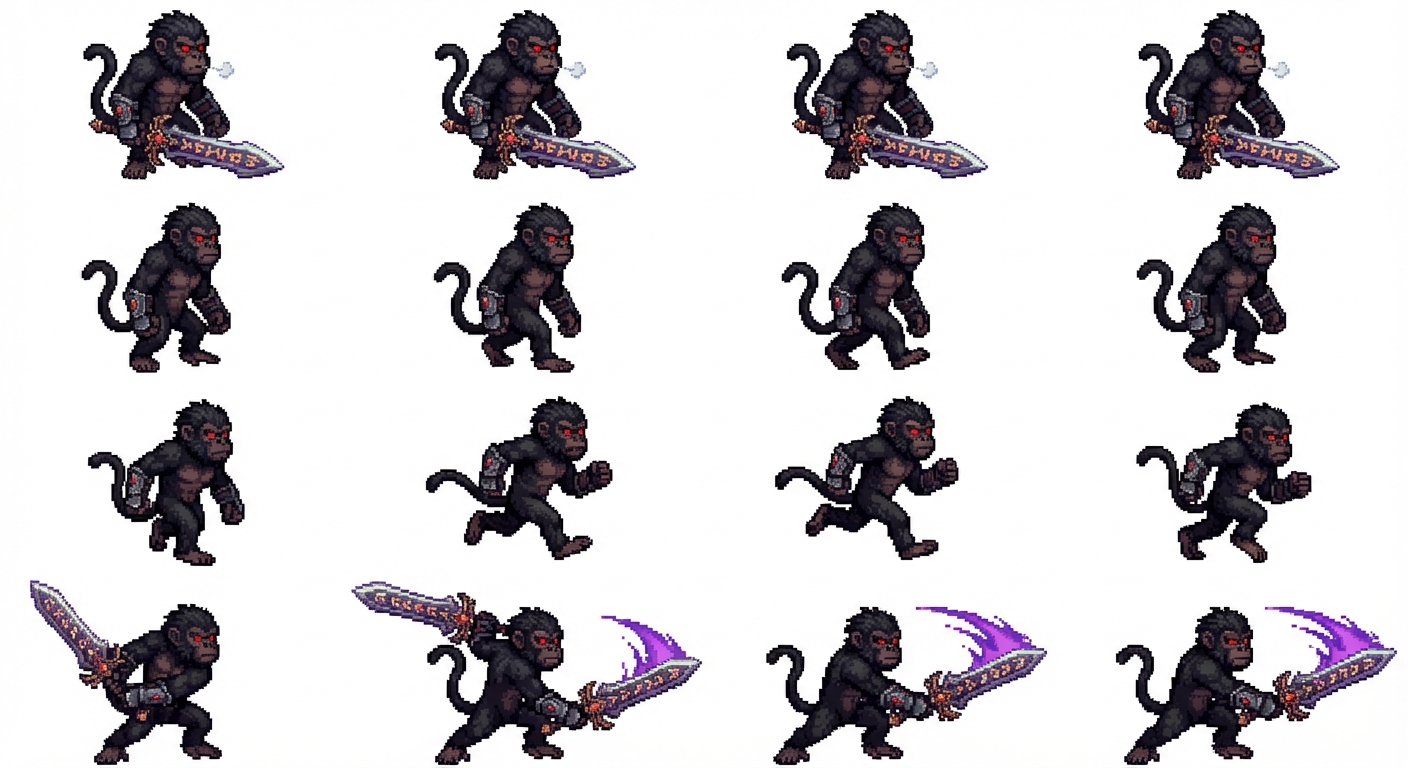 "create a highly-detailed pixel art top-down 3/4 view front facing view of a complex designed sword-wielding evil monkey enemy for a fantasy arpg game, isolated on a plain white background sprite sheet with idle, walking, running, and basic attack sprites "