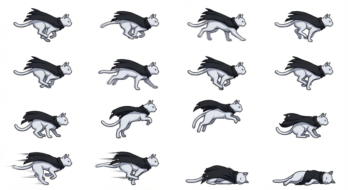 "white cat in a black shredded cloak running on all four, VERY fast for 8 frames, have a jumping animation thatis 4 frames, 2 frames for a dash and 2 frames for a death"