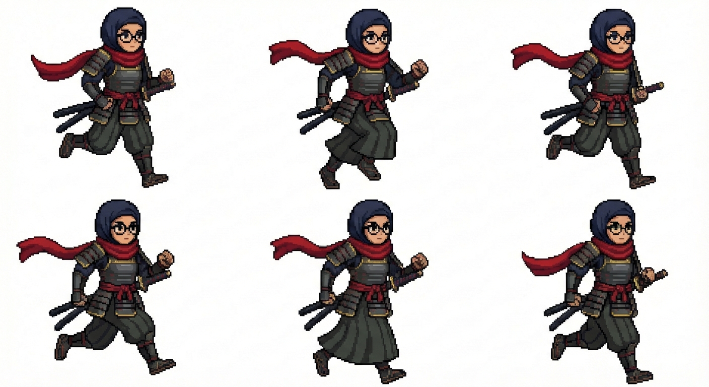 "female samurai with hijab and glasses. red scarf. running animation"