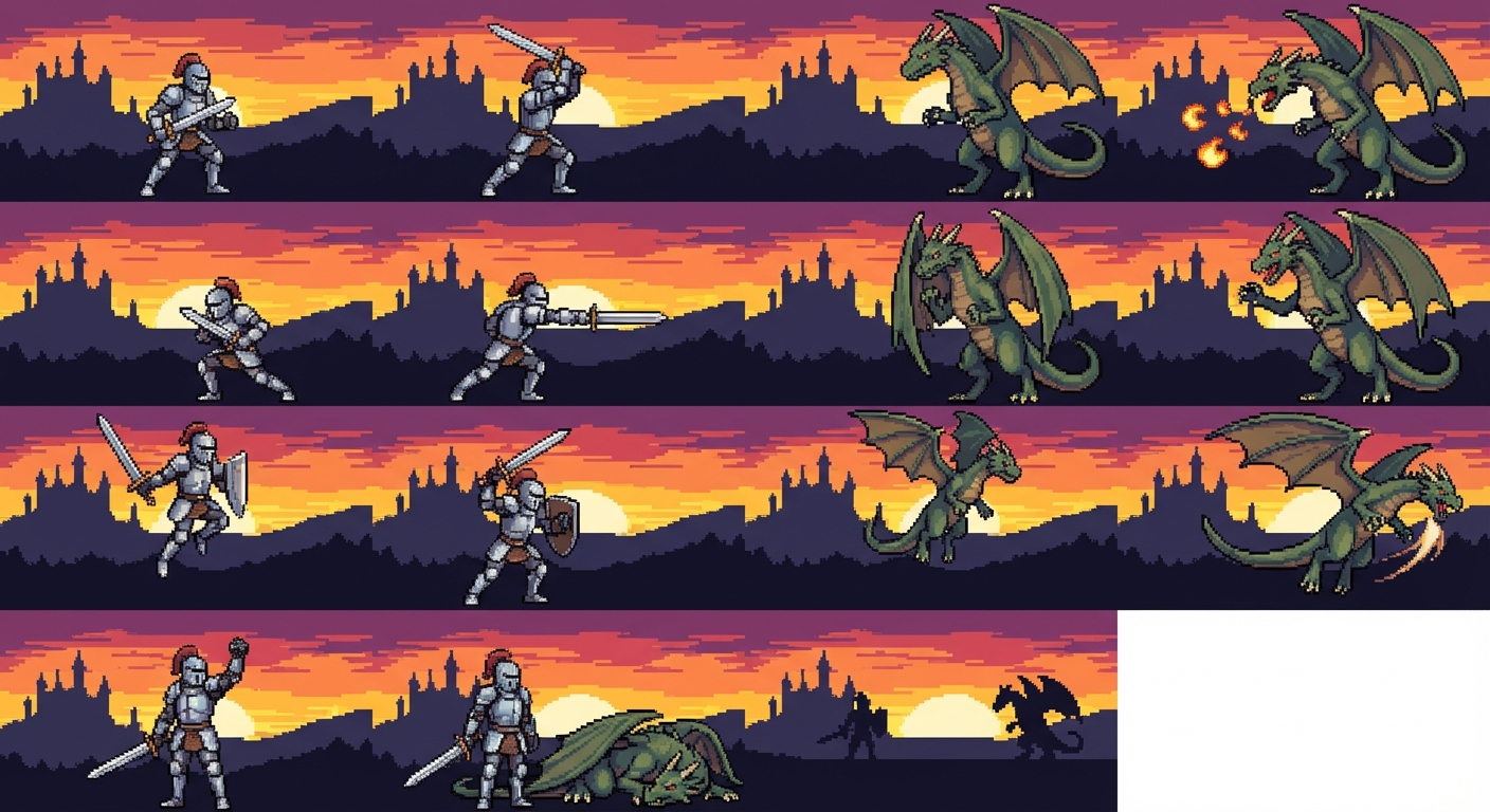 "рыцарь в доспехах с помощью меча дерется с драконом на фоне заката у замка"