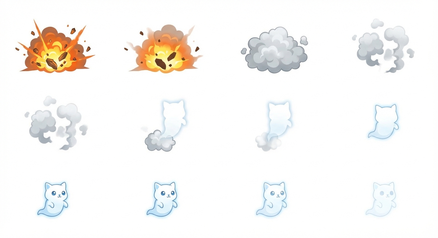 "explosion from crashing, turn into whitecat ghost"