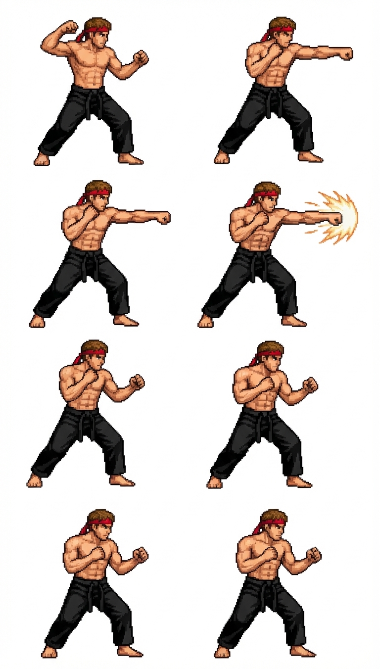 "Create a sprite of a white male kung fu fighter with no shirt and a red headband like the attached picture "