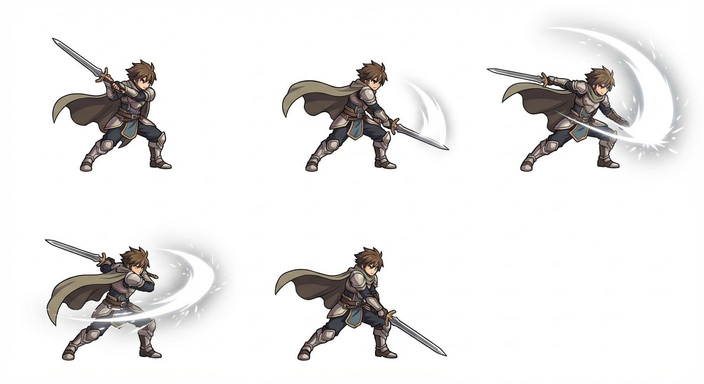 ""RPG-style sword slash, anime 2D, fast left-to-right motion, white slash with spark, 5 frames""