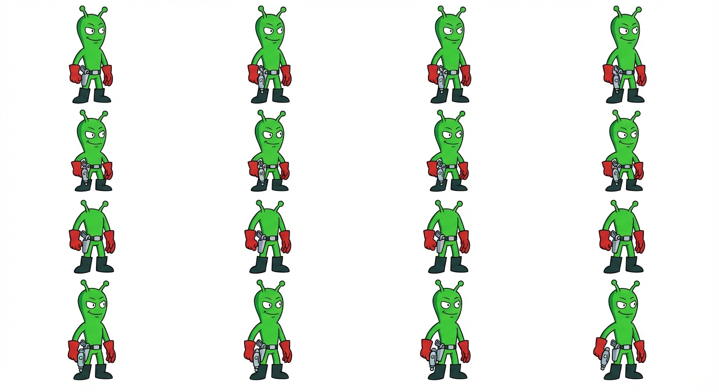 "2D cartoon alien zombie hunter, full body, front view, bright green skin, long oval head, two short antennae, big white eyes, funny confident smile, red gloves, silver sci-fi blaster, simple belt, flat colors, bold outline, mobile game style, plain background"