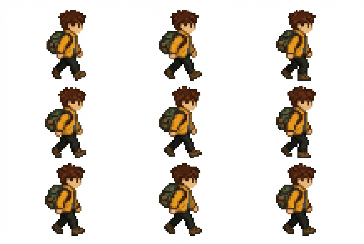 "Make him walk to the left with the backpack moving up and down"