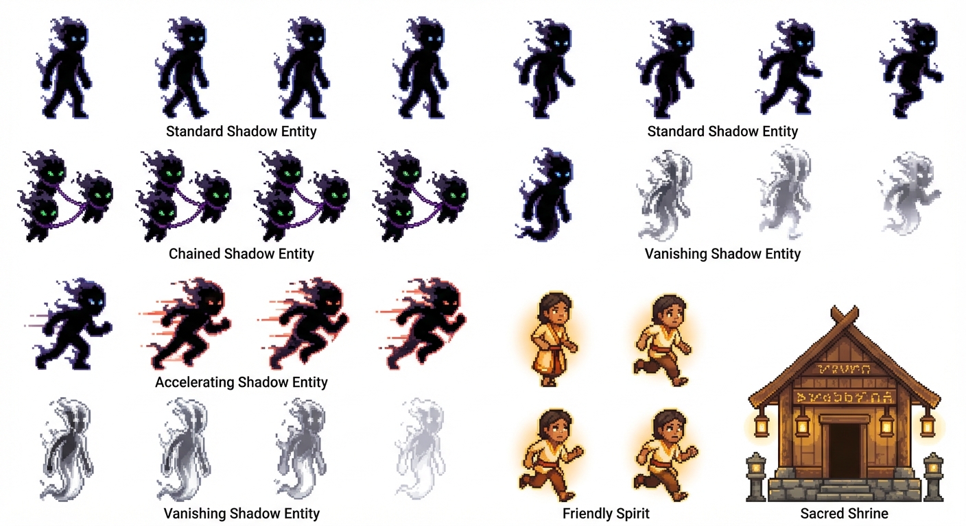 "Salinlahi is a 2D pixel art mobile defense game inspired by pre-colonial Filipino mythology. The visual tone should feel mythological, atmospheric, and slightly eerie, combining Baybayin cultural elements with shadow-corrupted spirits. Sprites should use clean pixel art with clear silhouettes, readable even at small sizes. Animations are minimal but expressive (4–6 frames). Core Enemy Sprites 1. Standard Shadow Entity The most common enemy. Appearance Humanoid silhouette made of condensed shadow or smoky darkness Body is not solid, more like drifting smoke with a faint outline Glowing eyes (pale blue or sickly green) act as the visual focal point Subtle shadow tendrils or wisps flowing from the body edges Chest area should remain clear and simple because a Baybayin character will be overlaid there in-game Personality Looks like a corrupted spirit Threatening but not human Moves slowly and steadily toward the shrine Sprite size ≈ 64x64 pixels 2. Chained Shadow Entity A smaller variant of the shadow enemy that appears in groups of three connected together. Appearance Same shadow aesthetic as the standard enemy Smaller and slightly simpler design Each entity is connected by thin dark energy chains or smoke links The chain looks like shadow energy connecting them Visual idea Three small shadow creatures moving as a linked group. Sprite size ≈ 48x48 pixels 3. Accelerating Shadow Entity A fast enemy that visually communicates speed and aggression. Appearance Similar body to the standard shadow enemy Leaning forward posture (more aggressive stance) Motion streaks or speed trails integrated into the sprite Walk animation may include ghosted afterimages Slight red or orange glow around the body edges to signal danger Visual idea A shadow creature that looks faster, more intense, and more aggressive than the others. 4. Vanishing Shadow Entity An enemy that periodically disappears. Appearance Thinner and more ethereal body Looks partially translucent or ghost-like Has cold white or silver highlights mixed with the dark shadow body Silhouette should be taller and more fragile Idle animation should include shimmering or flickering Visual idea A half-phased spirit, as if it exists between worlds. Friendly / Decoy Character Friendly Spirit or Villager This character must look clearly different from enemies. Appearance Warm colors: amber, cream, gold, warm brown Human silhouette, resembling a pre-colonial Filipino villager or gentle spirit Soft glowing aura or halo Clear facial expression showing fear or worry No smoke or darkness effects Visual idea A good spirit or villager running away from danger, not attacking. This character should visually communicate “do not attack.” Player Structure Sacred Shrine The structure the player must defend. Appearance Ancient Filipino shrine Built from carved wood and stone Decorated with Baybayin patterns and traditional carvings Lit with warm golden light (like lanterns or candles) Should feel sacred, protective, and culturally rooted Visual idea A small holy structure radiating warm light, contrasting with the dark enemies. Visual Style Summary Two emotional color zones define the game: Warm (safe side) Amber Gold Warm orange Cream Mahogany Dark (enemy side) Deep violet Black shadow Dark blue-gray Sickly green Enemies should feel like shadow corruption, while the shrine and friendly characters feel warm, sacred, and alive. Character silhouettes must remain instantly recognizable and clear at small pixel sizes., in Pixel Art style"