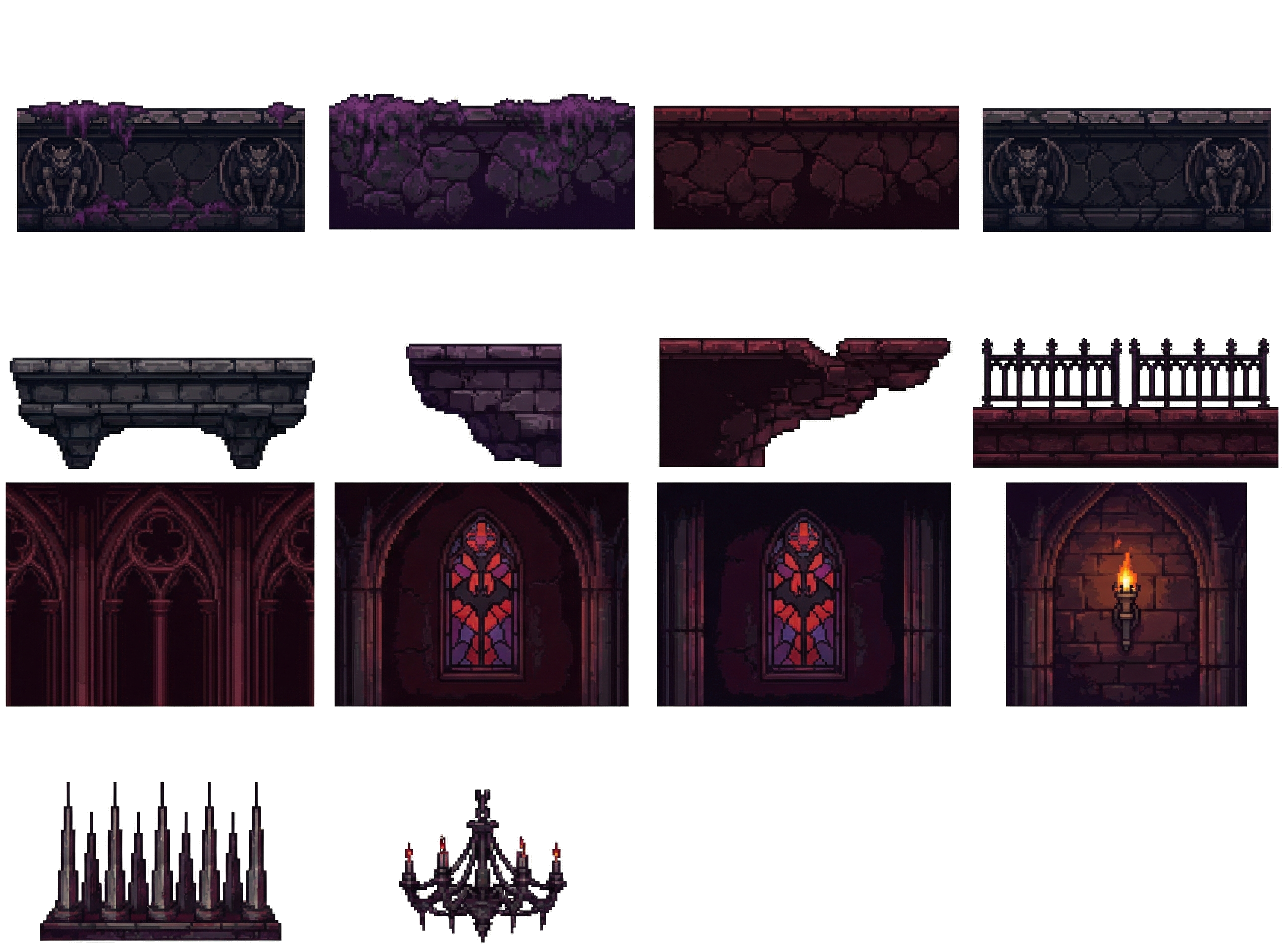 "do a 2d platformer of draculas castle with a gothic estetic just focus on the platform tiles , in Pixel Art style"