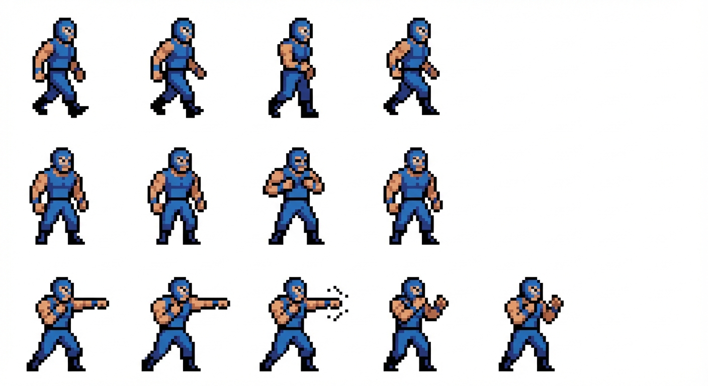 "restler in a mask with blue clothes walk, idle and punching sprites, in Pixel Art style"